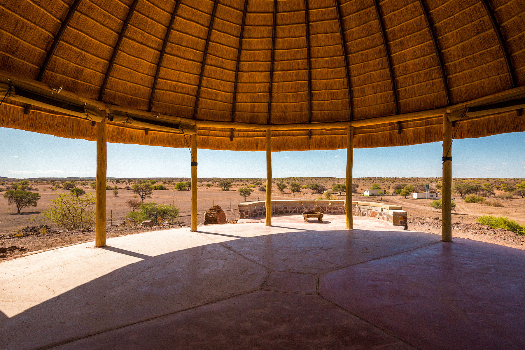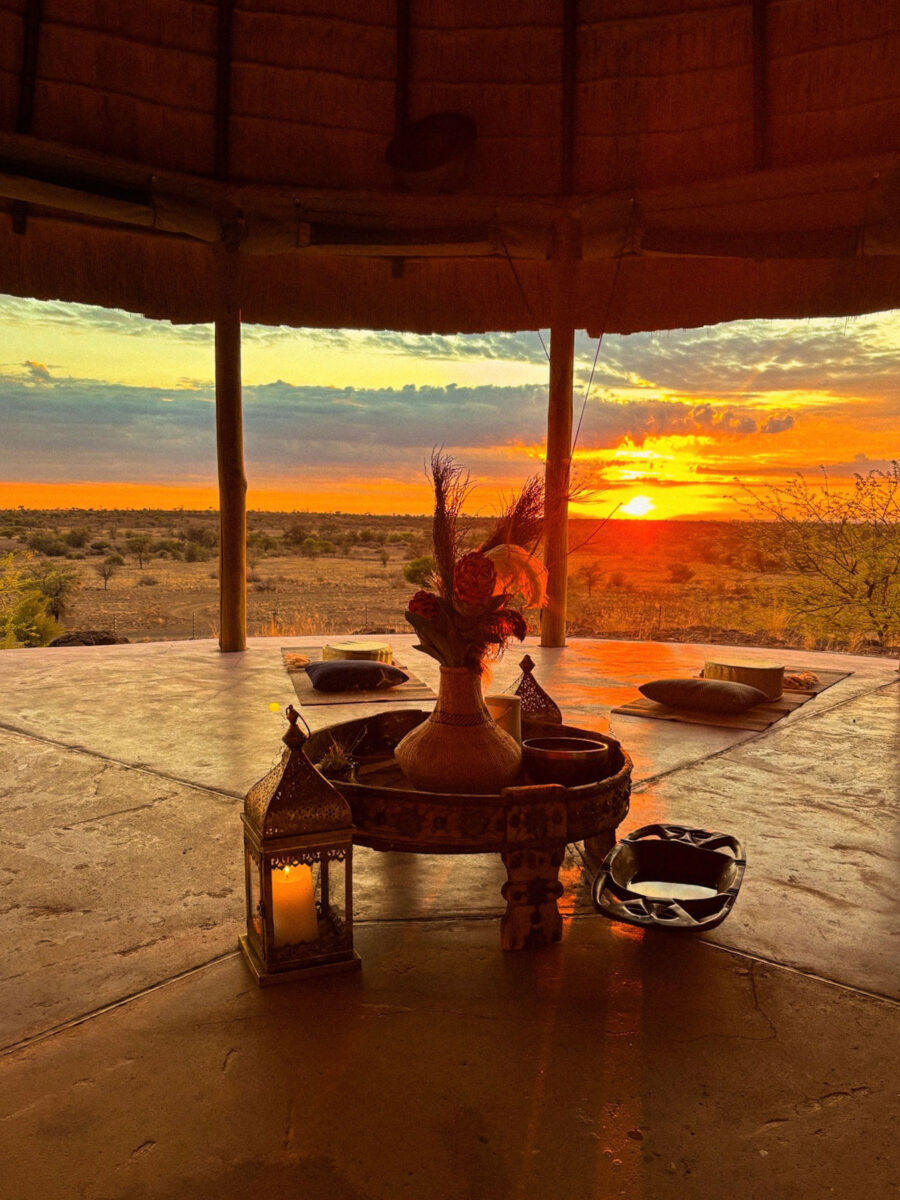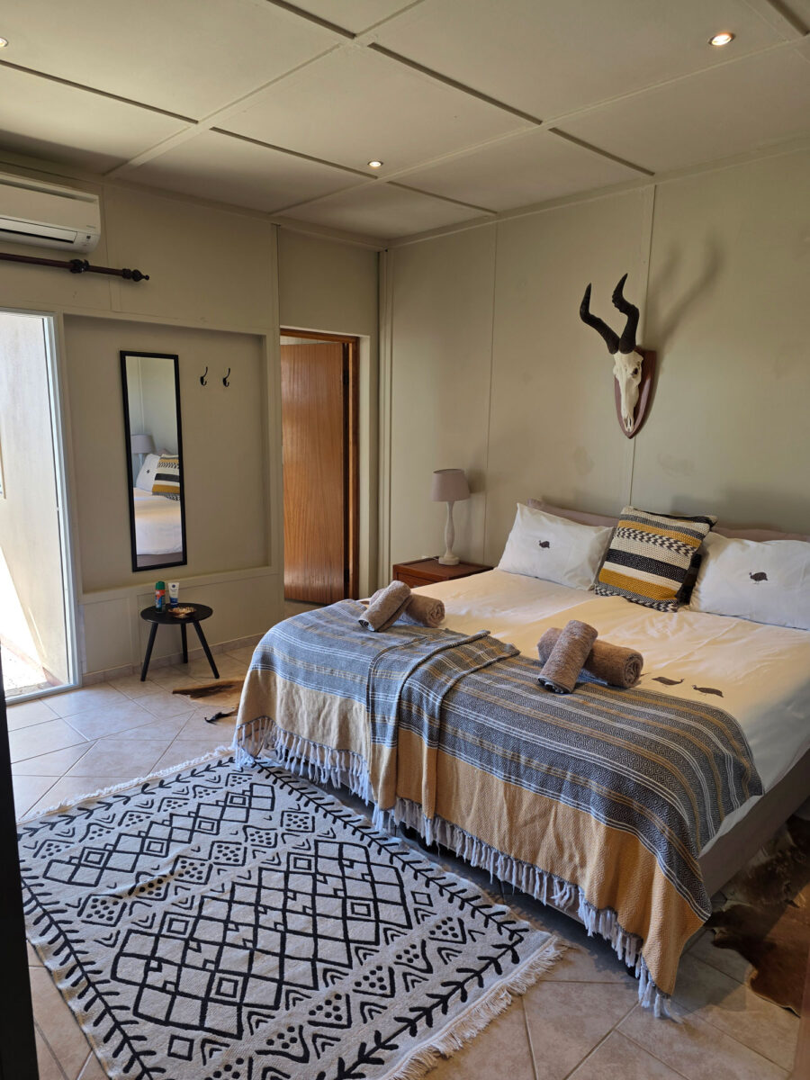 The campsite includes a bush shower with warm water heated by a traditional “donkey”, a bush toilet, and a covered cleaning area, everything needed for simple comfort in the wild.